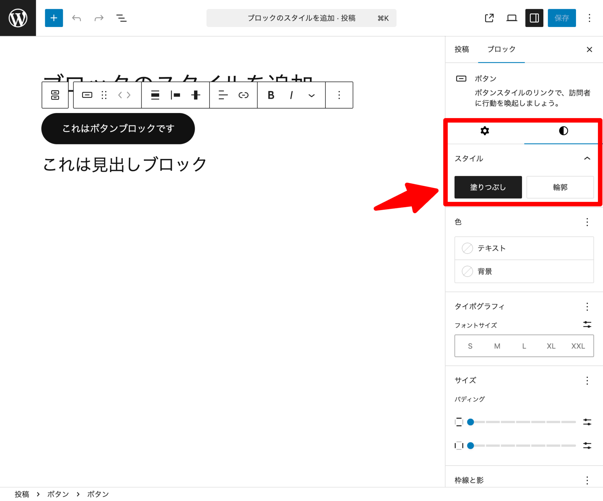 ボタンブロックだとデフォルトで「塗りつぶし」と「輪郭」があります。