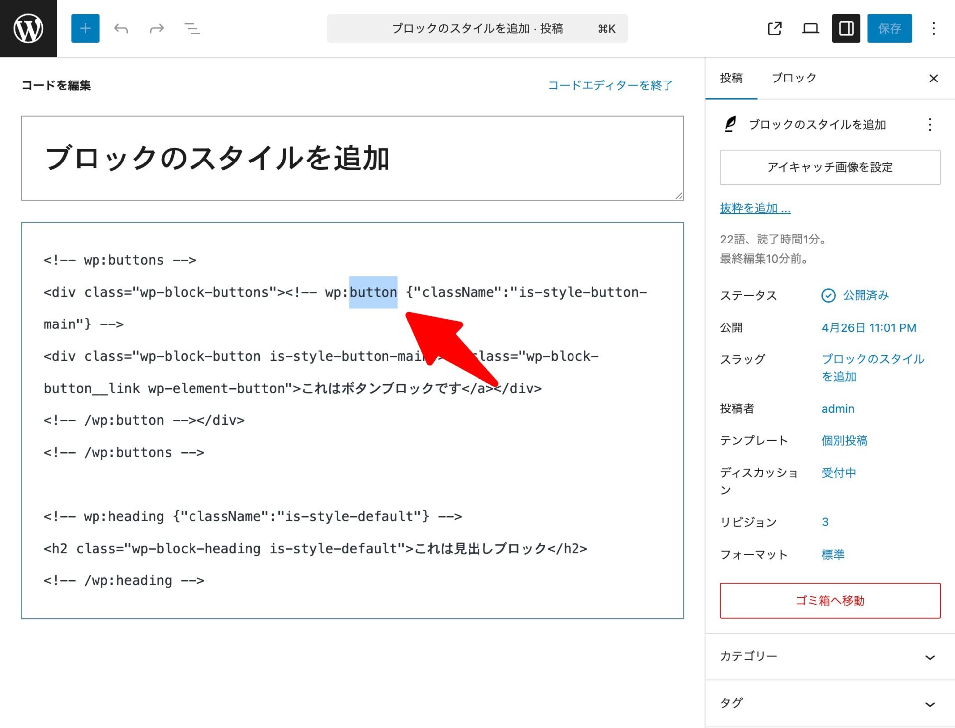ブロックの名前は、エディターをコードエディターにすると簡単に調べられます。