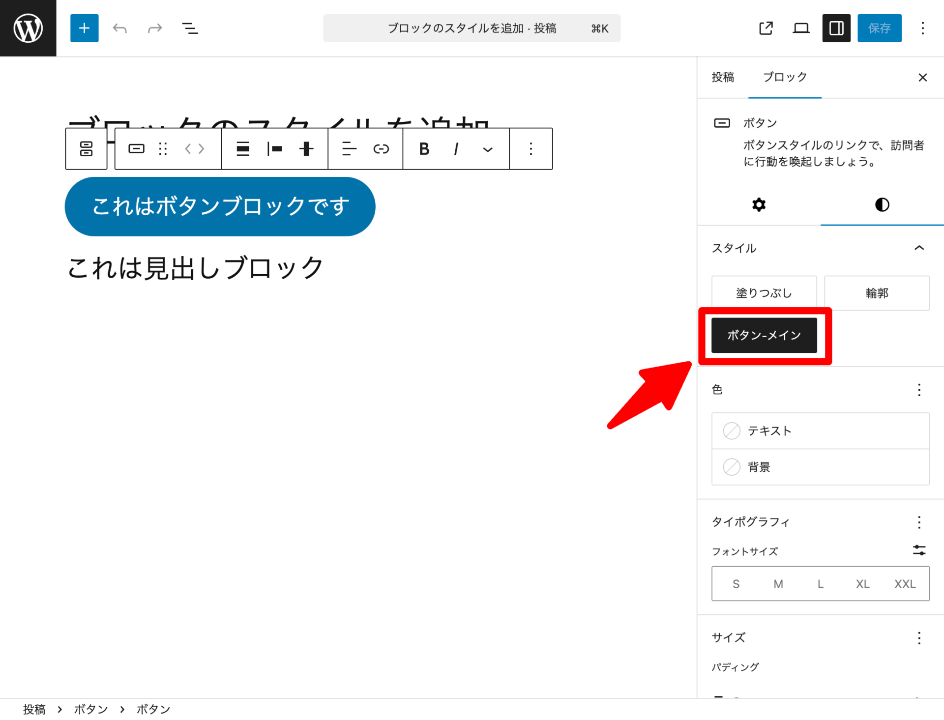 ブロックエディターでこのスタイルを選択すると、HTMLには is-style-button-main というクラスが付きます。